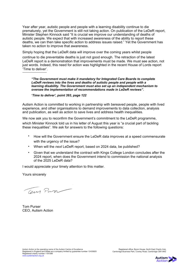 We wrote to the Health Secretary, Wes Streeting, in July this year, along with many others, including bereaved family members, people with lived experience and other charities. We thank everyone who supported that work. We received a response from Minister Stephen Kinnock in August, but this provided little reassurance about the Government’s commitment to improving LeDeR and using it to save lives.