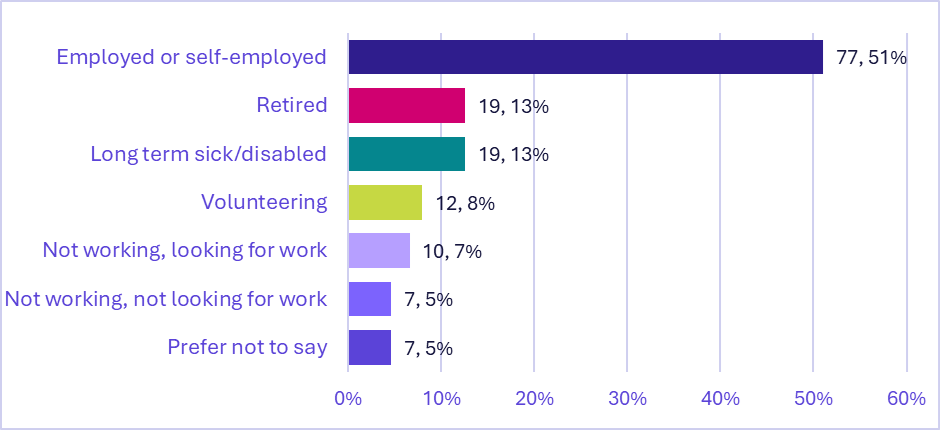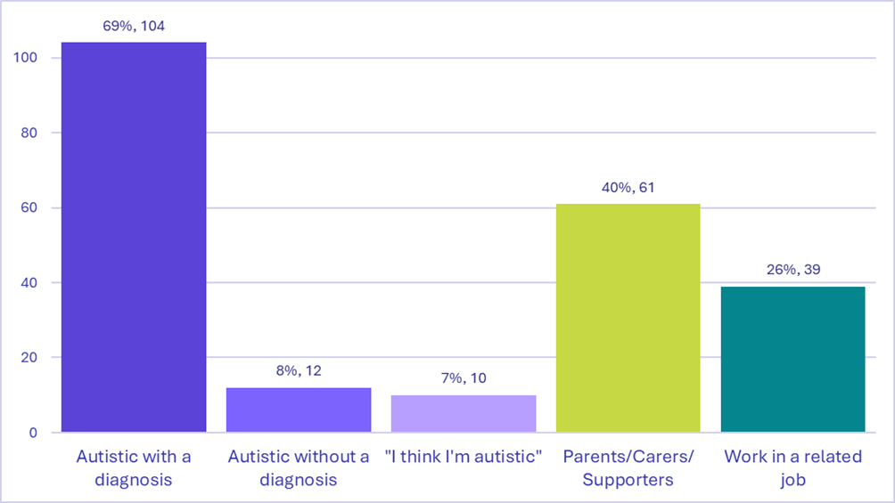 Only 8% of people who responded said they have a learning disability. 13% of parents/carers said they support an autistic person with a learning disabilty and 4% said they support somebody who uses Augmentative or Alternative Communication or doesn’t use words to communicate.