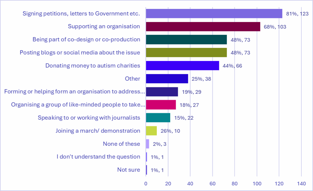 The people who responded to our survey are clearly doing a lot already, as we might expect from a group that has joined the advisory panel for a charity. The most common activity was adding their name to petitions or letters to Government, followed by supporting organisations, getting involved in co-design or co-production, writing blogs and social media posts, and donating money to autism charities. Each of these was reported by over 60 people.